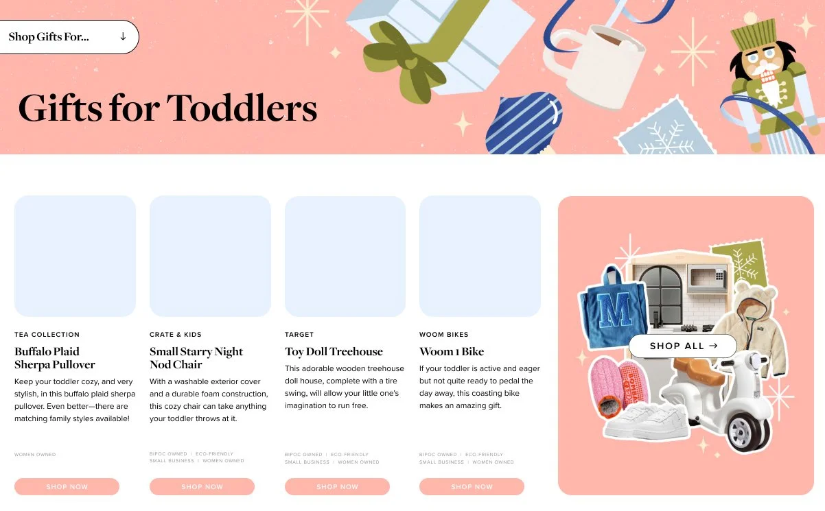 Each year, The Everymom releases a highly-anticipated gift guide featuring hundreds of gift recommendation across a dozen or more categories. This immersive holiday shopping experience includes a hub page—home to featured gifts across all categories—shopping pages for each category, social media content, and a curated newsletter campaign. The visual identity for 2022 embodies the nostalgic and whimsical feeling of childhood holidays, which was brought to life with a jewel-bright color palette and over 100 custom illustrations.