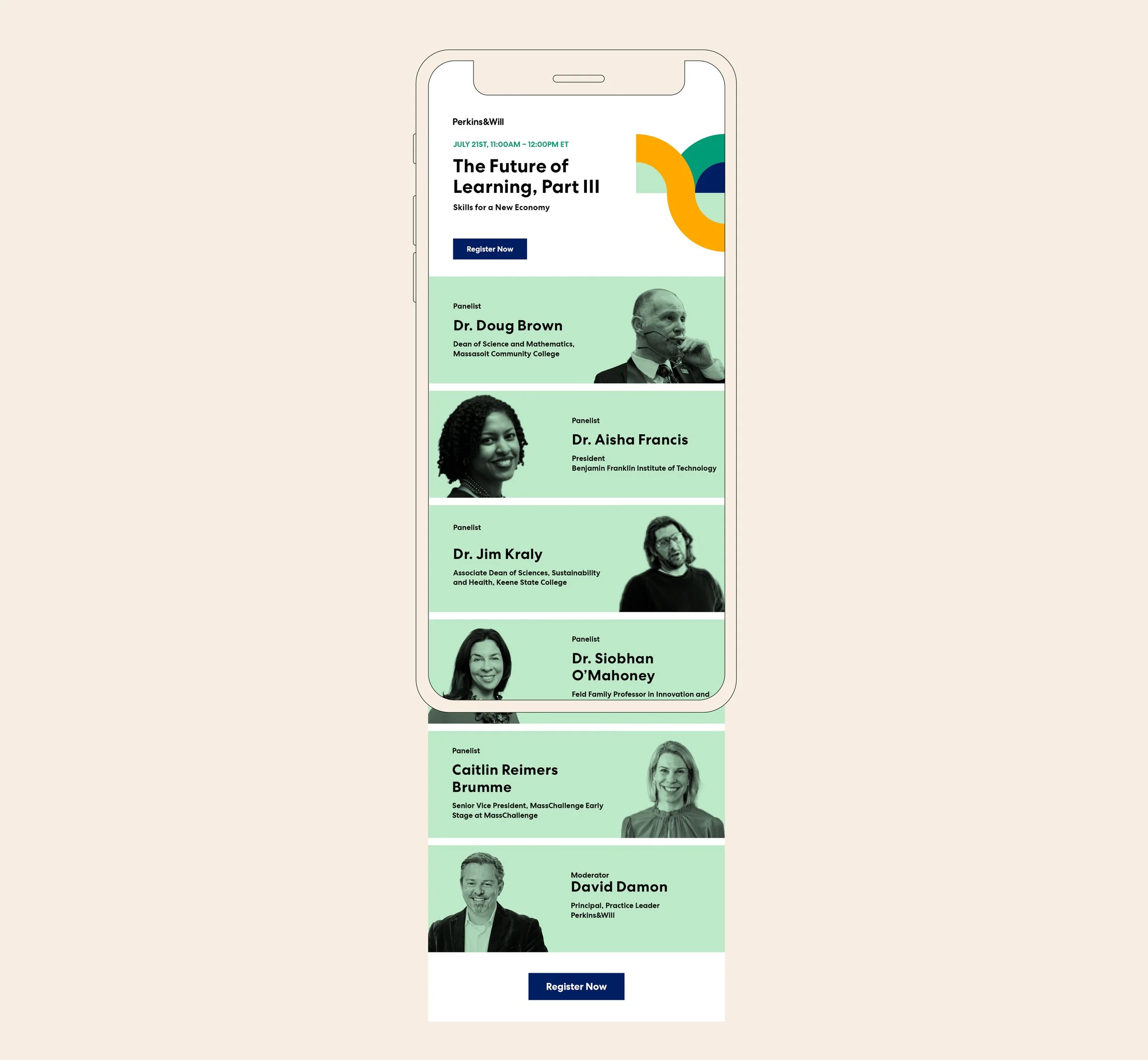 The event series included email communications, an event site and livestream hosting platform, social media graphics, and summary documents. Graphic elements fit squarely into the Perkins&Will brand identity, relying on a flexible system of geometric compositions in a limited color palette as the core of the sub-identity.